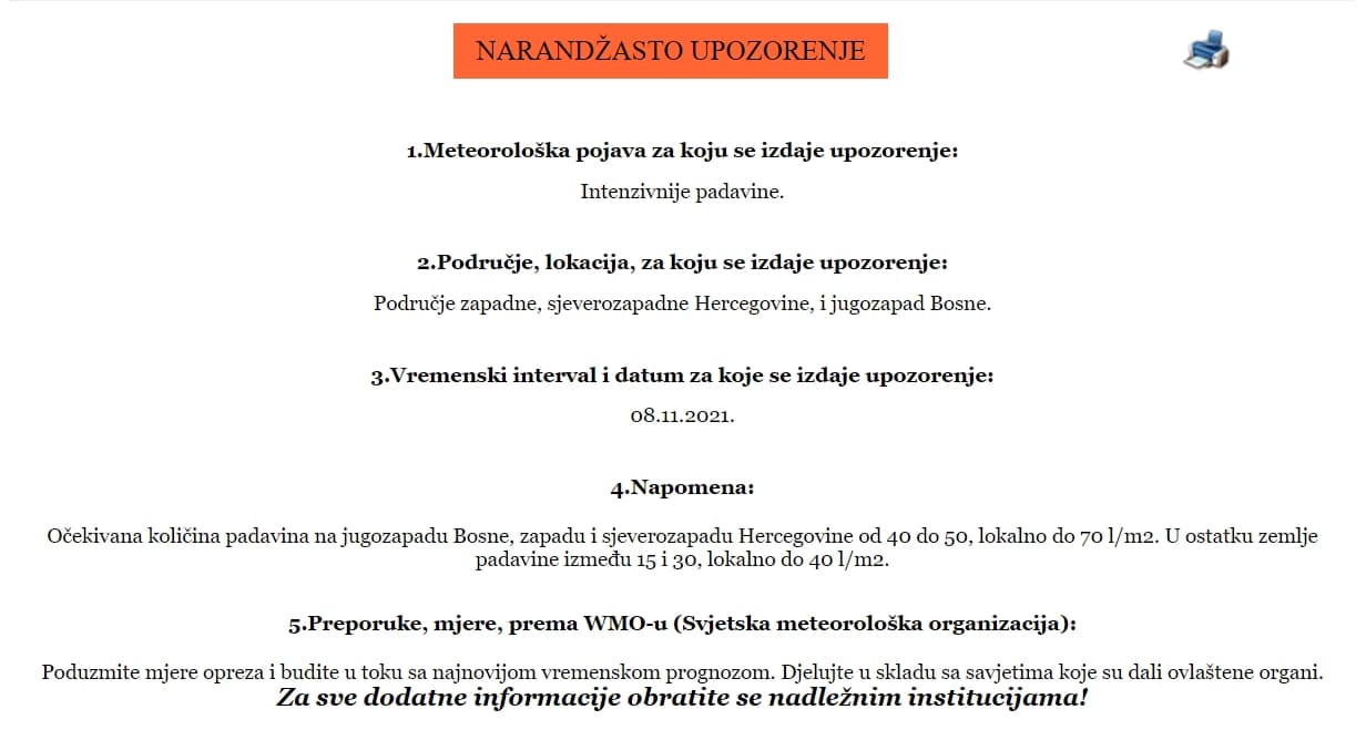 Upozorenje je izdato za područja zapadne i sjeverozapadne Hercegovine i jugozapada Bosne.