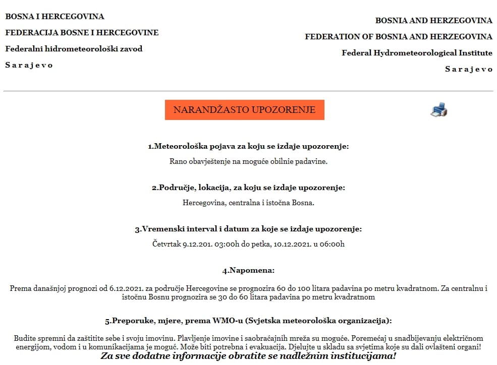 Rano obavještenje se odnosi na period od četvrtka, 9. decembra, od 03:00 pa do petka, 10. decembra, do 06:00. Upozorenje se odnosi na područje Hercegovine, centralne i istočna Bosne.