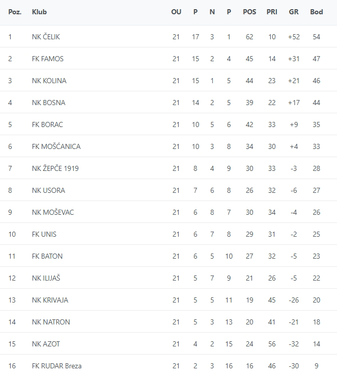 Ekipa Famosa je tako iskoristila kiks Koline te preuzela drugo mjesto sa 47 bodova. Za Krivaju je ovo bio 11. ovosezonski poraz, te ostaje na 20 bodova, a u narednom kolu će u komšijskom derbiju gostovati u Maglaju ekipi Natrona.