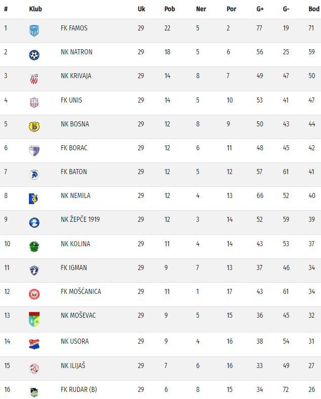 Rudar je posljednji sa 26 bodova, Ilijaš ima jedan bod više, Usora 31, a Moševac 32 boda.
