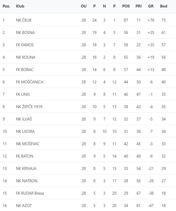 Rudar je tako iskoristio poraz NK Azot koji je sada posljednji na tabeli sa 18 bodova koliko ima i brezanska momčad, ali uz lošiju gol razliku. Ekipa iz Vitkovića je poražena u Zavidovićima u NK Krivaja, a za petardu Krivaje i pobjedu od 5:0 het-trik je postigao Meris Selimović, uz po jedan gol Idriza Hodžića i Nedima Rotića.