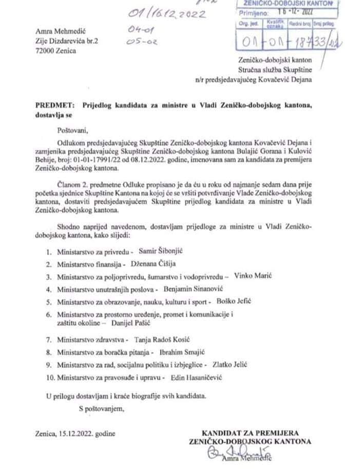 Mandatarka za formiranje Vlade Zeničko-dobojskog kantona i buduća premijerka ove Vlade Amra Mehmedić je predložila spisak ministara.