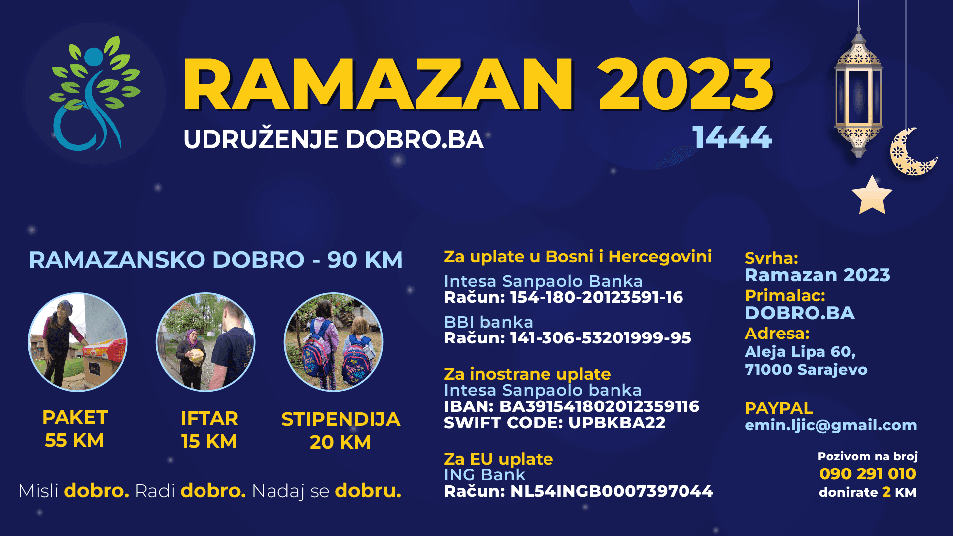 Humanitarno udruženje DOBRO.BA pokrenulo je akciju „Ramazan 2023“, a u cilju prikupljanja pomoći za socijalno-ugrožene porodice, organizaciju iftara, te prikupljanje sredstava za fond stipendija.