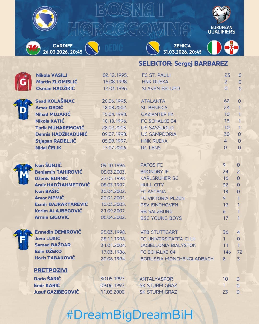 „Pred nama je veoma važno okupljanje i prilika da napravimo veliki uspjeh. Vjerujem u ovu ekipu tu ono što radimo i nadam se da ćemo 31. marta igrati finale baraža pred našom publikom. Na spisku su igrači za koje jerujemo da mogu odgovoriti zahtjevima ovako važnih susreta. Tu su, u odnosu na prethodna okupljanja, dva nova igrača, Nidal Čelik i Jovo Lukić. Oni su svojim igrama i formom u posljednje vrijeme skrenuli pažnju na sebe. Znamo da nas u Kardifu očekuje težak meč protiv Velsa, ali naš cilj je da odigramo hrabro i ponosno i da pokušamo izboriti pozitivan rezultat koji bi nas doveo korak bliže plasmanu na Svjetsko prvenstvo. Vjerujem da ova reprezentacija ima kvalitet za velike stvari”, izjavio je selektor Sergej Barbarez.