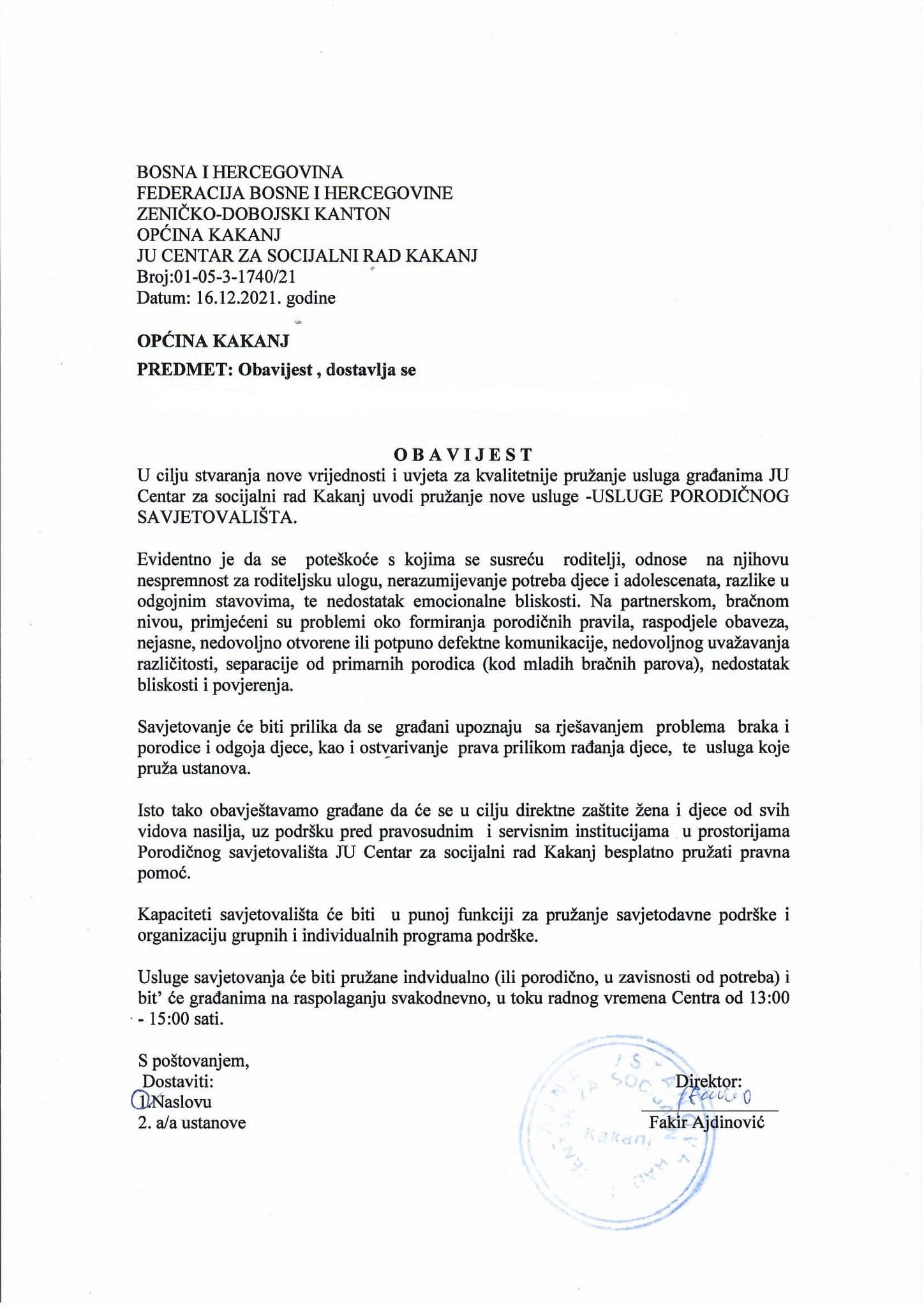 U cilju stvaranja nove vrijednosti i uvjeta za kvalitetnije pružanja usluga građanima, JU Centar za socijalni rad Kakanj je uvela novu uslugu porodičnog savjetovališta.