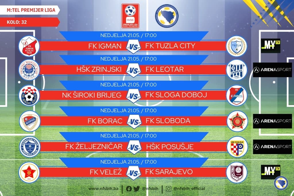 Danas će biti odigrani mečevi pretposljednjeg 32. kola m:tel Premijer lige BiH u fudbalu, a svi susreti su na programu od 17 sati.