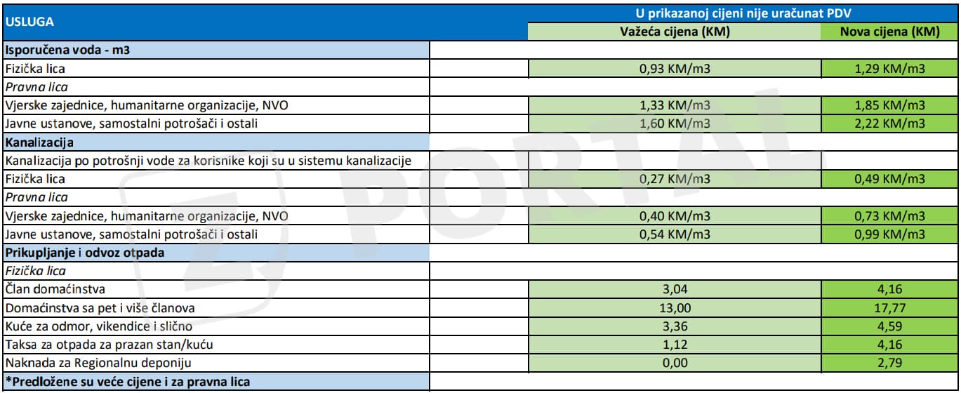 Cijena vode po m³ bi se povećala za cca. 0,39% bez PDV-a, kako za fizička, tako i za pravna lica, a osim toga povećale bi se cijene uključenja i isključenja sa sistema. Novi cjenovnik predviđa i povećanje izdavanja saglasnosti, analiza vode, kao i taksi i naknada za vodovod, te troškova kanalizacija po potrošnji vode za više od 80% bez PDV-a.