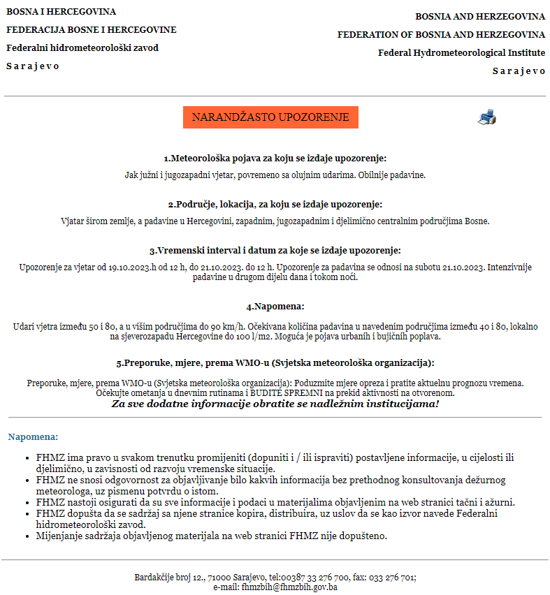 Udari vjetra će biti između 50 i 80, a u višim područjima do 90 km/h. Očekivana količina padavina u navedenim područjima između 40 i 80, lokalno na sjeverozapadu Hercegovine do 100 l/m². Moguća je pojava urbanih i bujičnih poplava.