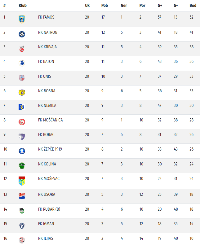 Vodeći Famos je poslije jučerašnje pobjede protiv Unisa rezultatom 3:0 dodatno povećao prednost na čelu tabele. Mak Bajrić, Eldar Mulaosmanović i Tarik Pehilj su bili strijelci za Motoriste.
