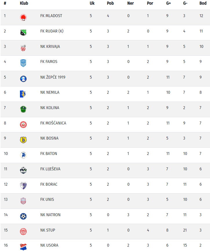 Nakon pet kola, listu strijelaca predvodi golgeter Liješeve Mahir Bajrić sa osam golova, a prati ga Haris Šošić iz Batona koji je postigao gol manje. Rudarov Abdullfatai Shuaib i Krivajin Mirsad Šijerkić su postigli po pet golova.