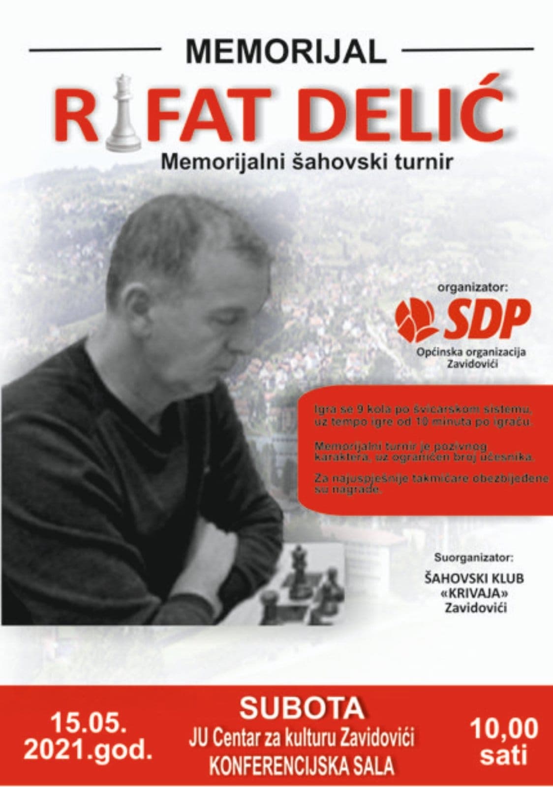 U organizaciji Općinske organizacije Zavidovići Socijaldemokratske partije Bosne i Hercegovine (SDP BiH) ovog vikenda će biti održan memorijalni šahovski turnir u znak sjećanja na Rifata Delića.