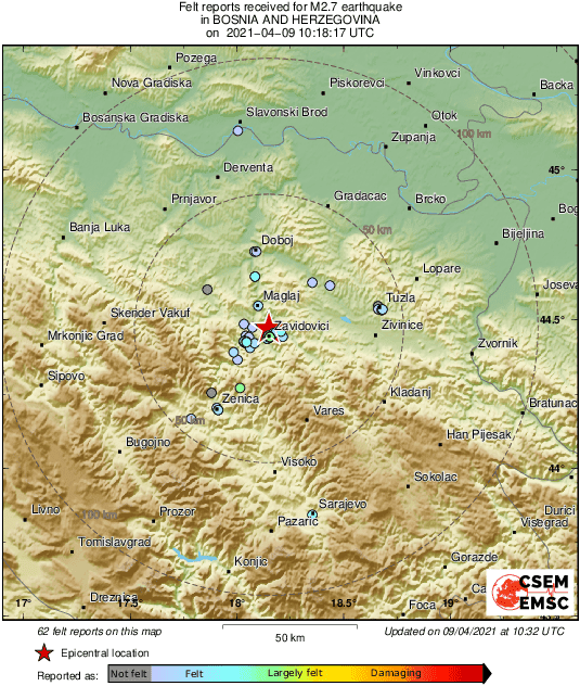 Međunarodni alati za praćenje jačine potresu su pokazali da je epicentar bio 24 kilometra od Doboja, no prema posljednjim ažuriranim informacijama stoji da je epicentar istog bio na tri kilometra sjeverno od Zavidovića i magnitude 2.7 po Richteru.