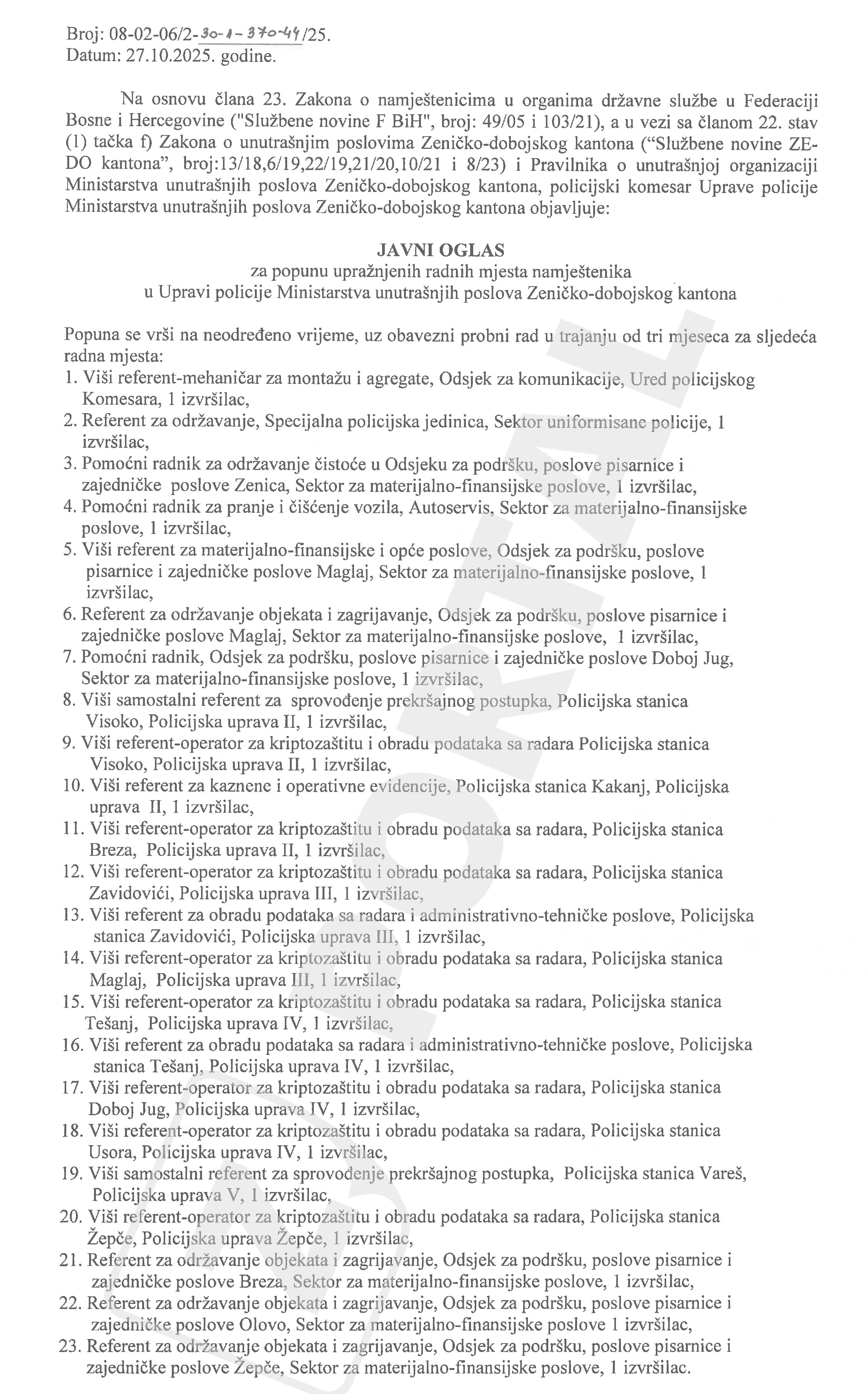 Uprava policije Ministarstva unutrašnjih poslova Zeničko-dobojskog kantona objavila je Javni oglas za popunu upražnjenih radnih mjesta namještenika.