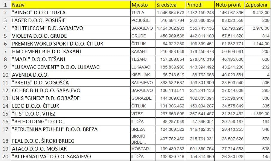 Na čelu kolone je Bingo d.o.o. Tuzla s neto dobiti većom od 146,5 miliona konvertibilnih maraka, navodi Biznis.ba. Osim najveće dobiti, ova kompanija je imala uvjerljivo i najveće prihode, a prednjači i po broju uposlenih sa preko 8400 radnika.