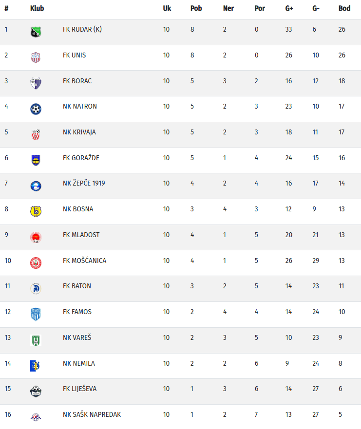 Nakon ovog kola Rudar je preuzeo prvo mjesto sa 26 bodova, koliko ima i Unis, dok je Borac na 18 bodova, a slijede Natron i Krivaja sa po 17 bodova. Na začelju tabele su Liješeva sa šest i SAŠK sa pet bodova.
