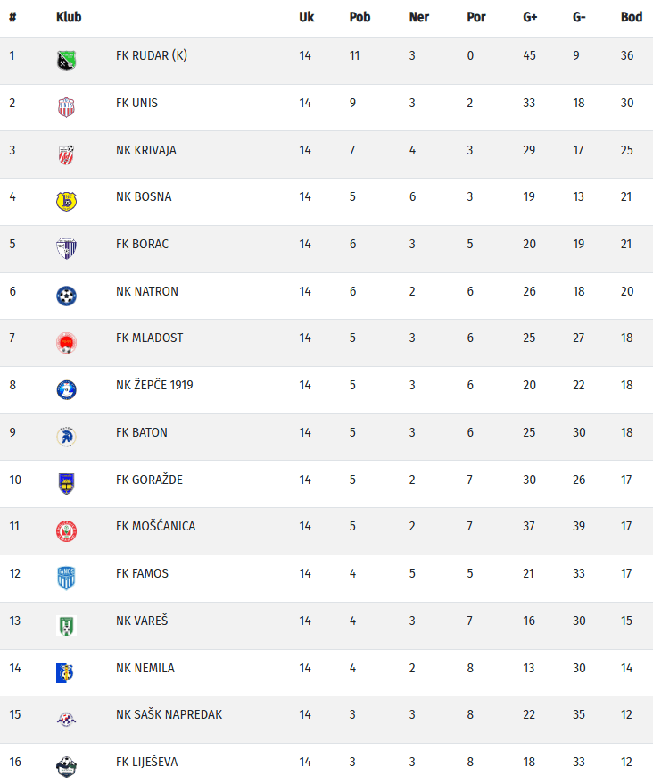Kolo prije kraja prvog dijela sezone Rudar je na čelu tabele sa 36 bodova, a slijedi Unis sa 30 i Krivaja sa 25 bodova. Na začelju tabele su Liješeva i SAŠK Napredak sa po 12 bodova, dok Nemila na svom kontu ima 14.