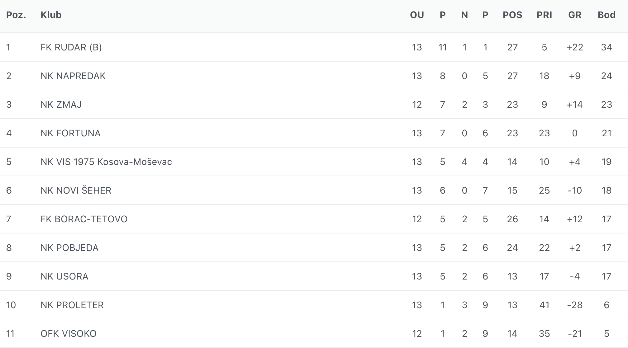 Na jedinoj jučerašnjoj utakmici Rudar je u Brezi nastavio svoj pohod ka tituli, a domaći su deklasirali Proleter sa 5:0. Dva pogotka za Brezanske Bebe je postigao Kerim Bajtarević, dok su se u listu strijelaca upisali i Amel Handžić, Sandi Sejdić te Faruk Selimović.