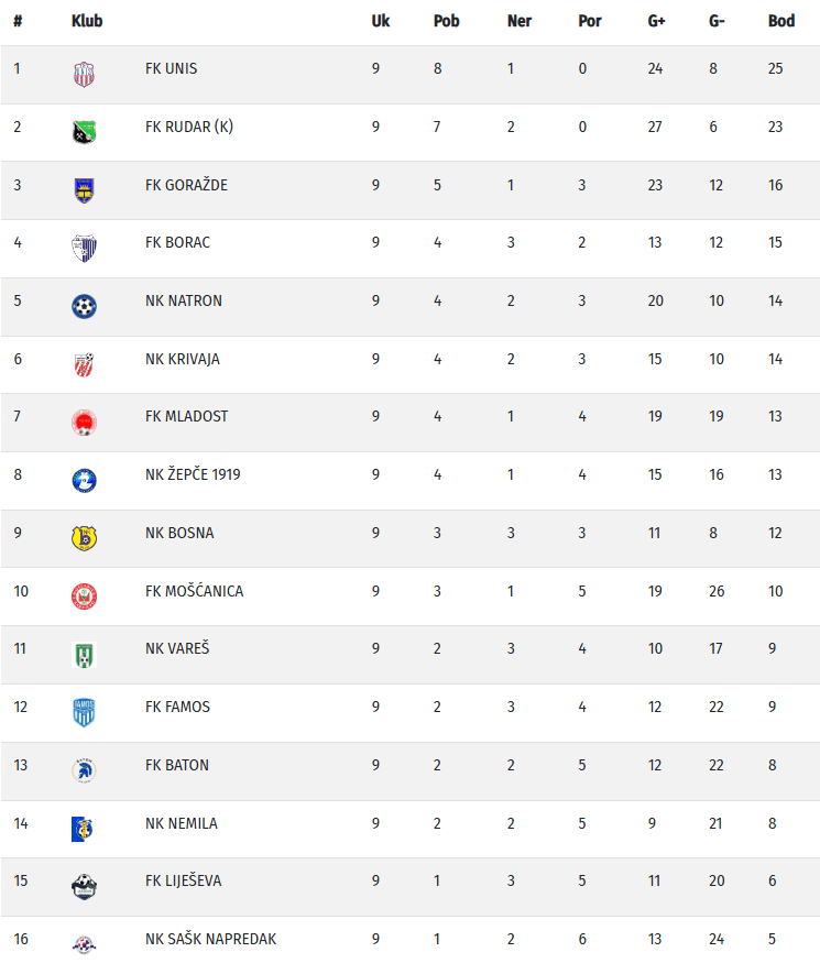 Nogometaši Krivaje poraženi su u Vogošći od prvoplasiranog Unisa s minimalnih 1:0, a gol odluke je postigao Armin Cibra na isteku prvog poluvremena.