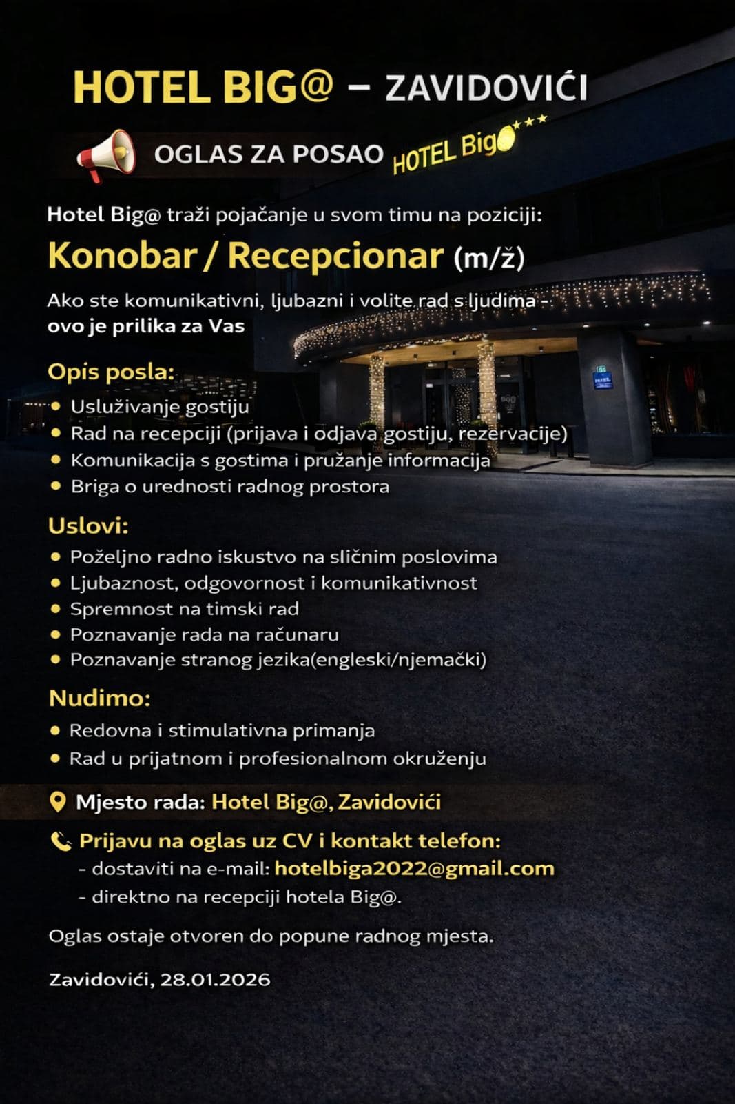 Hotel BIGA iz Zavidovića objavio je javni oglas za posao, a na poziciju konobara/recepcionera.