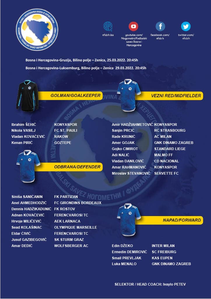 U Sarajevu je danas održana press konferencija na kojoj je selektor fudbalske reprezentacije Bosne i Hercegovine Ivaylo Petev objavio imena igrača na koje računa za prijateljske susrete sa Gruzijom i Luksemburgom.