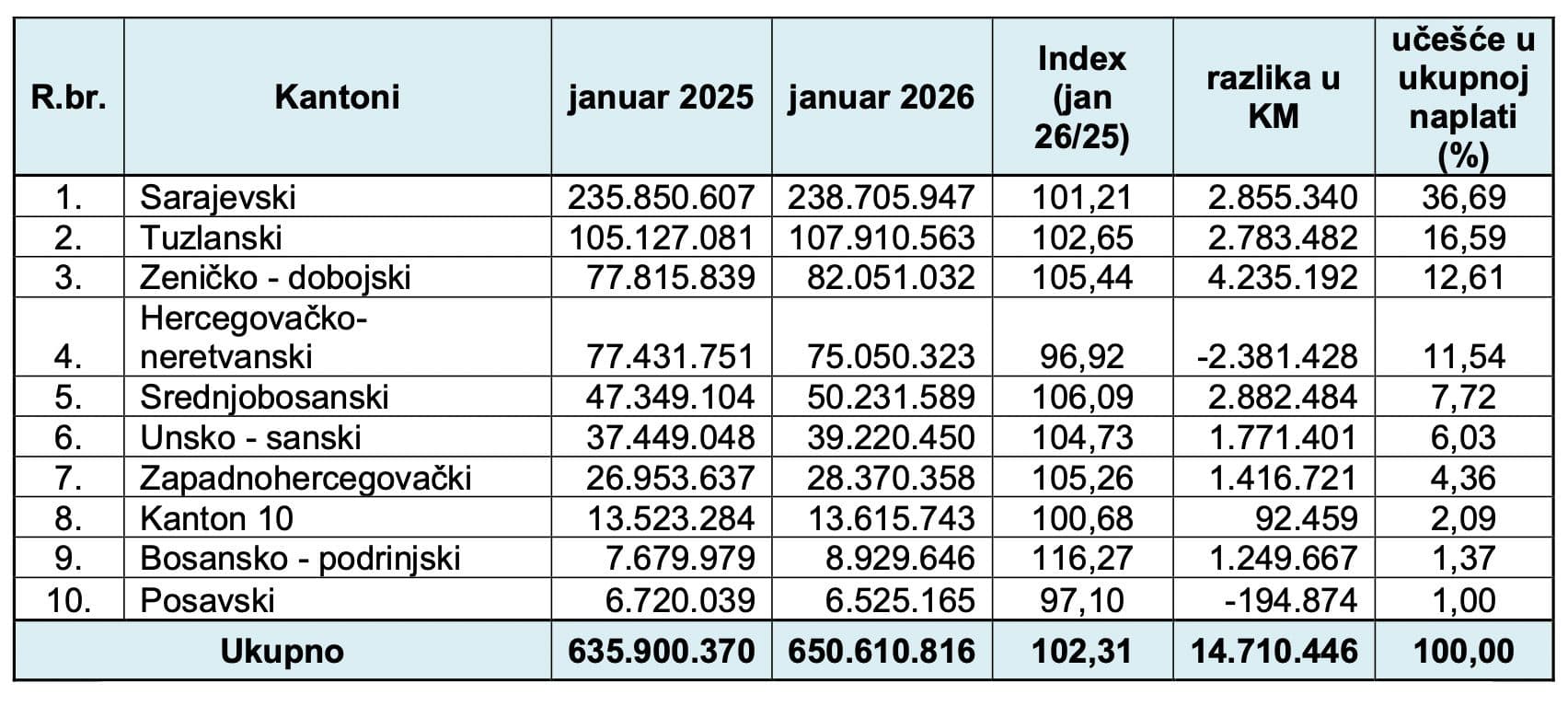 U odnosu na januar prošle 2025. godine zabilježeno je povećanje za 14.710.446 KM, odnosno, uplaćeni javni prihodi su veći za 2,31%.