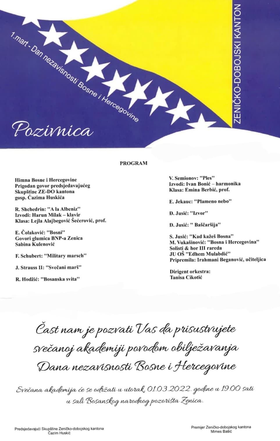 Svečana akademija povodom Dana nezavisnosti Bosne i Hercegovine će biti održana 1. marta u Bosanskom narodnom pozorištu Zenica s početkom u 19 sati.