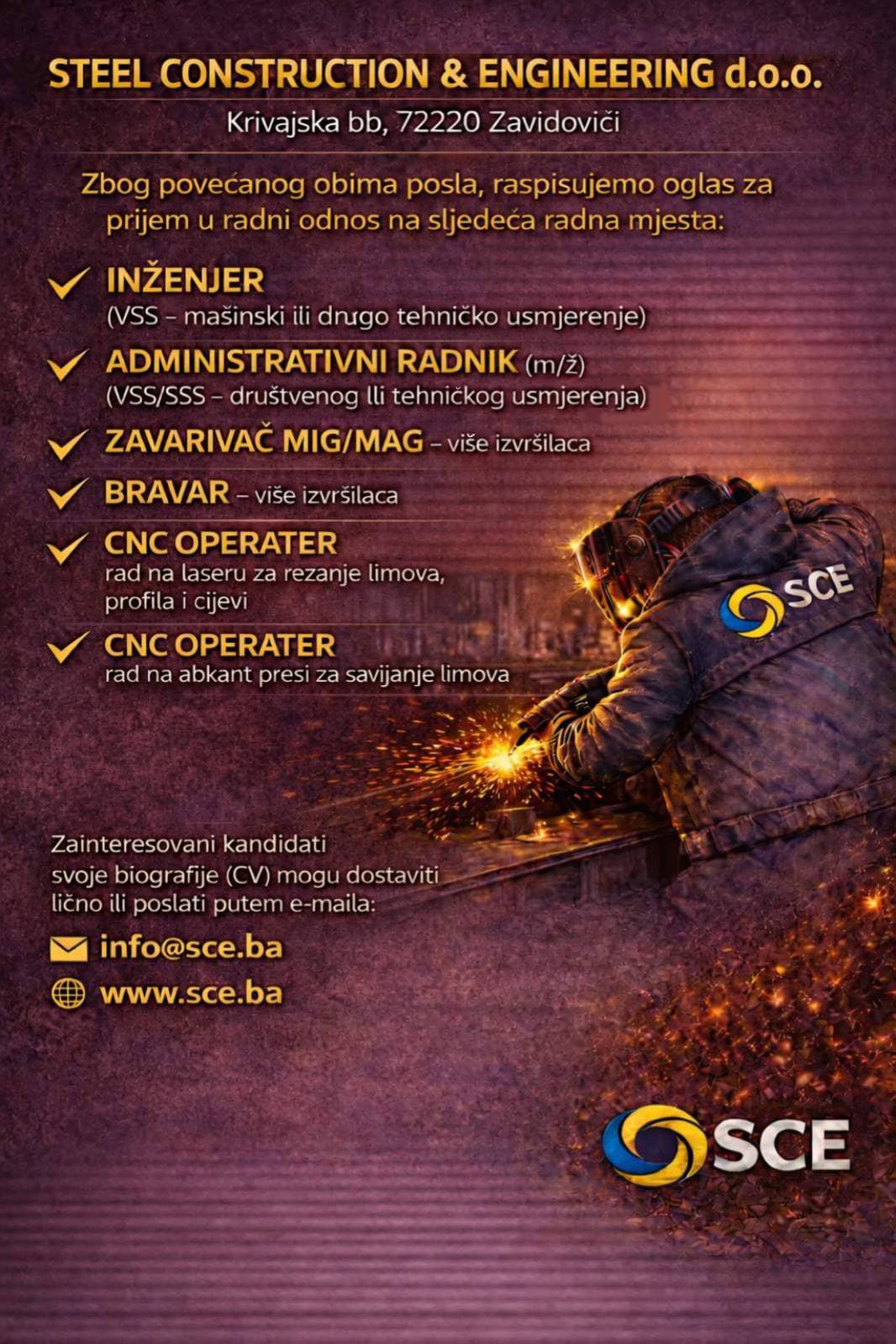 Kompanija Steel Construction & Engineering d.o.o. Zavidovići, sa sjedištem u Ulici Krivajska u Zavidovićima, raspisuje oglas za prijem radnika.