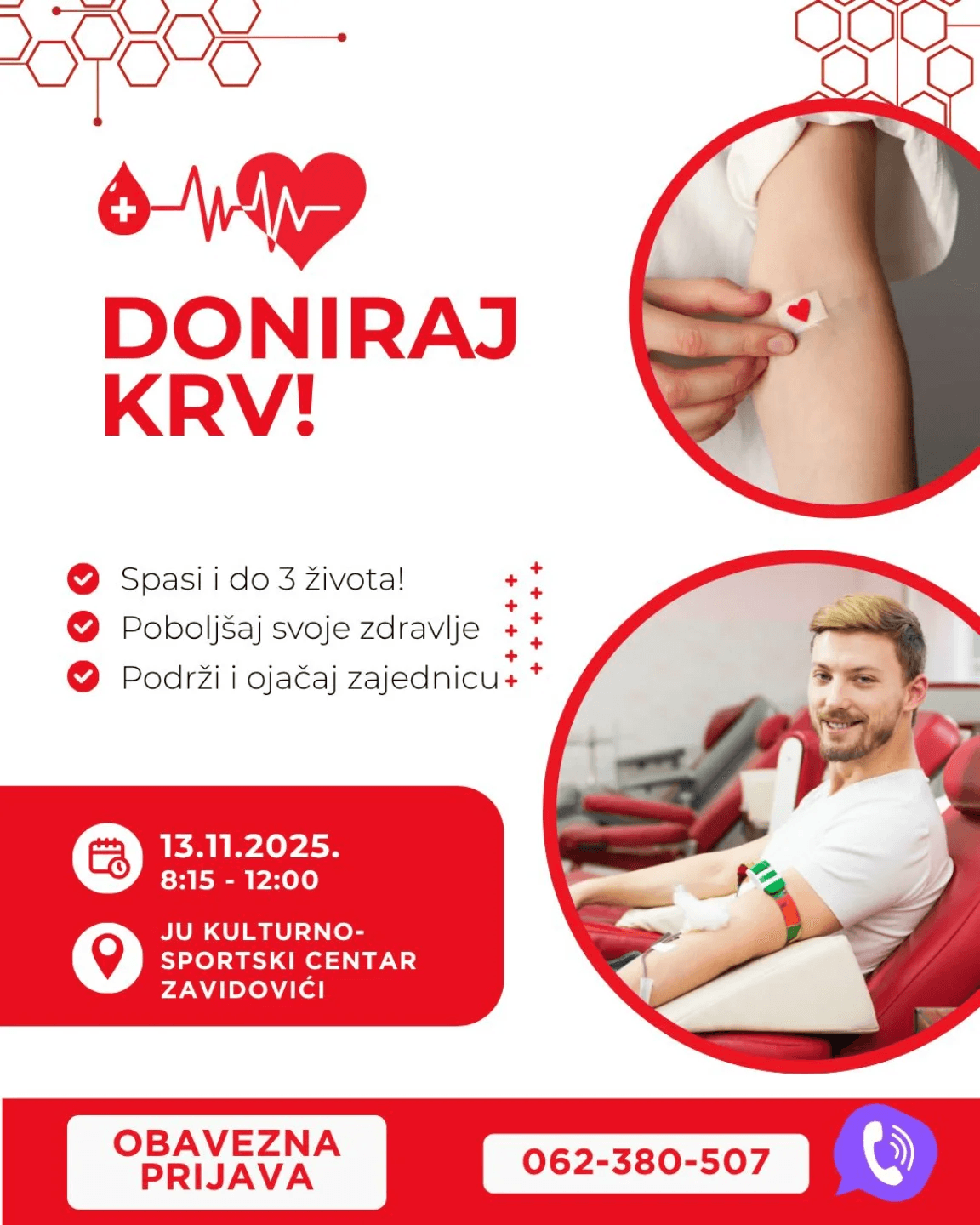Akcija će biti održana u sali JU “Kulturno-sportski centar” Zavidovići, u terminu od 8 do 12 sati, uz obaveznu prijavu putem broja telefona 062/380-507.
