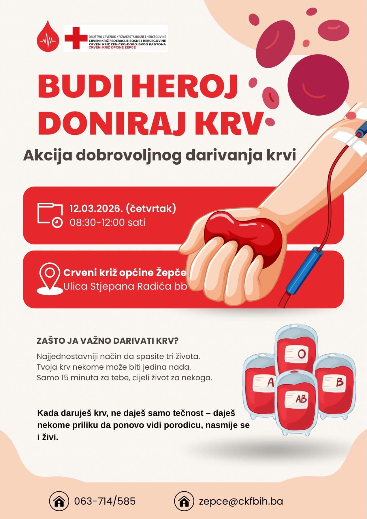Akcija će se održati u prostoriji Crvenog križa općine Žepče, a u terminu od 8:30 do 12 sati. Prikupljene doze će se koristiti za potrebe Transfuzijskog centra Kantonalne bolnice Zenica.