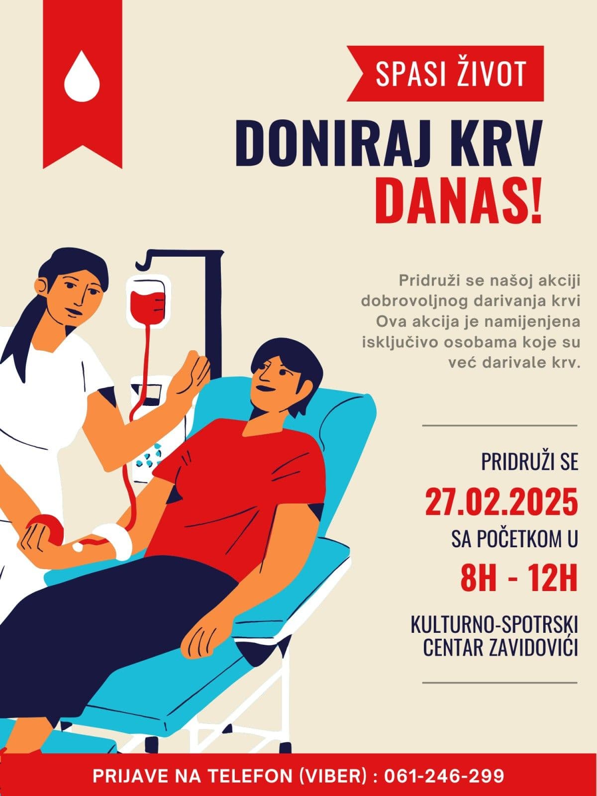Riječ je o akciji koja je namijenjena isključivo osobama koje su već darivale krv, a ista će trajati od 8 do 12 sati u prostorijama JU “Kulturno-sportski” Centar Zavidovići.