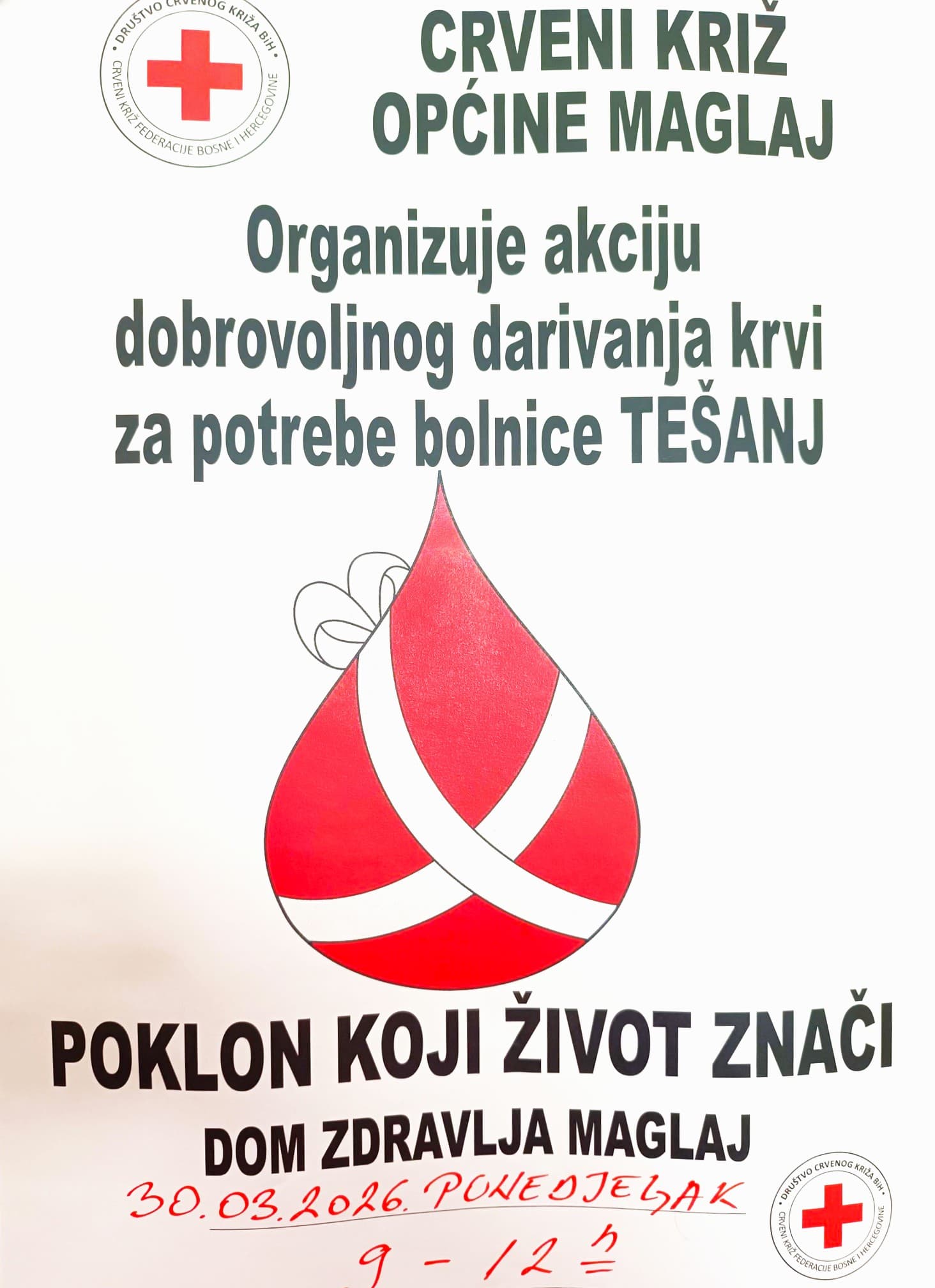 U organizaciji Crvenog križa općine Maglaj, u ponedjeljak 30. marta, bit će upriličena akcija dobrovoljnog darivanja krvi.