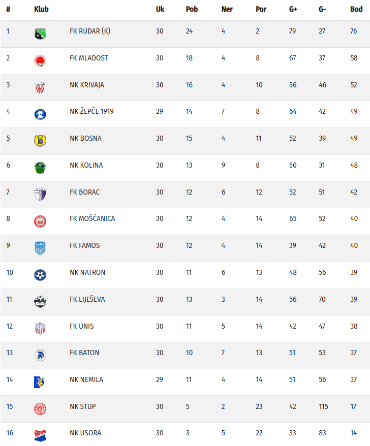 Uz nastavku vam donosimo tabelu nakon 30. kola. Napomena: U tabeli još nije ažuriran rezultat utakmice NK Žepče 1919 – NK Nemila (zvanična odluka, s.r. 3:0). S navedenom pobjedom NK Žepče 1919 će u konačnici završiti kao trećeplasirani zbog bolje gol razlike u odnosu na NK Krivaja.
